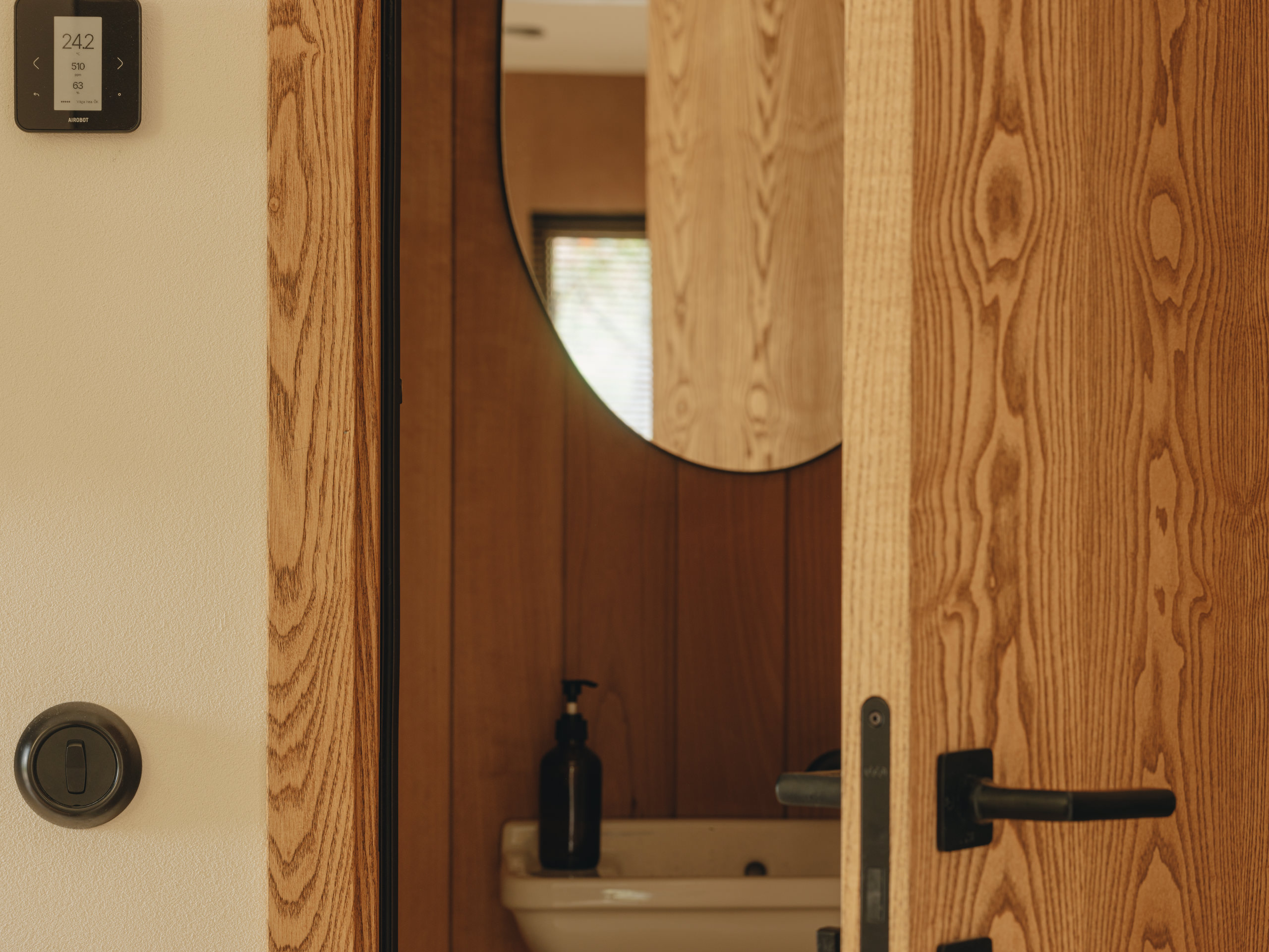 - Sügavamad, mahedad toonid, nagu hall või roheline, annavad ruumile intiimse ja mõnusa meeleolu. Konjakitooni parkett harmoneerub spoonitud uste ning lae laudisega, mis rõhutavad interjööri modernistlikku ja ajatut joont.