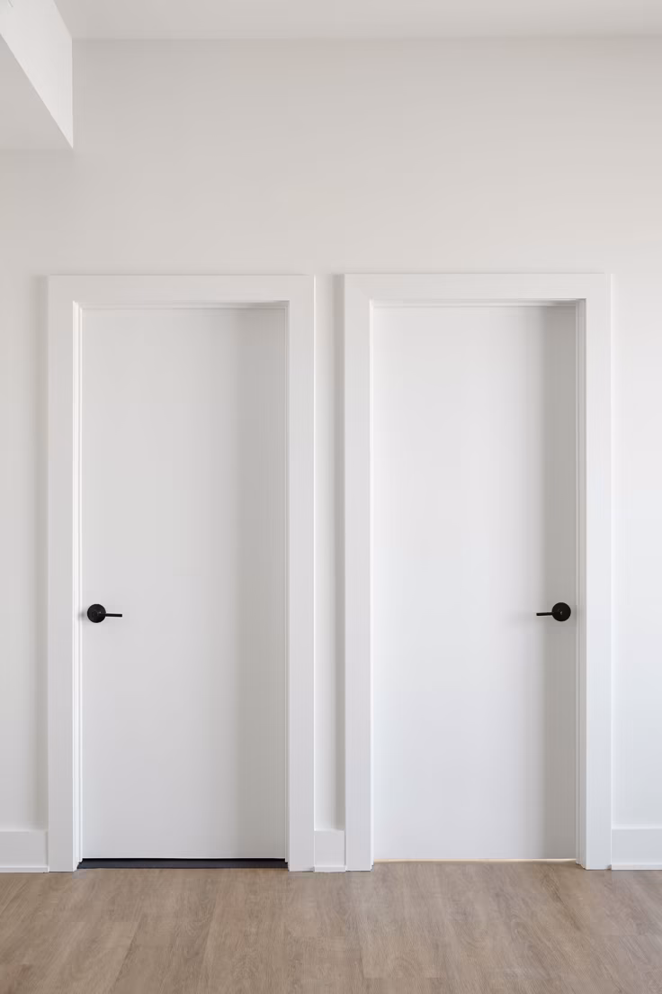 - 8. Värvitud puituksed, seinaga sama tooni Caparol Naturweiss (magnetlukk, peithinged). Kõrgus 2,3 m.